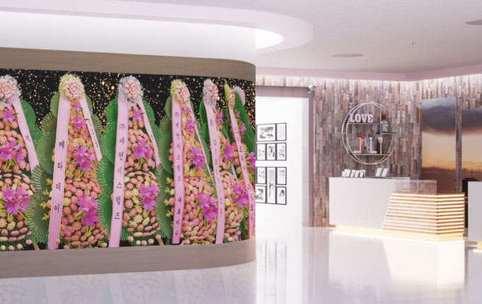 결혼식장에 실제 축하 화환 대신 고화질 포스터 디스플레이에 디지털 화환을 보여주는 서비스 입니다
