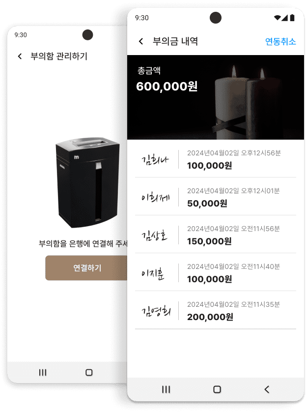 종이봉투에 돈을 넣고 이름을 써서 부의함에 넣으면 자동으로 이름과 돈의 액수가 디지털로 저장 됩니다